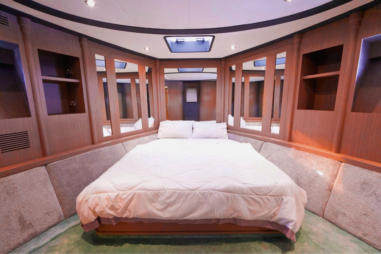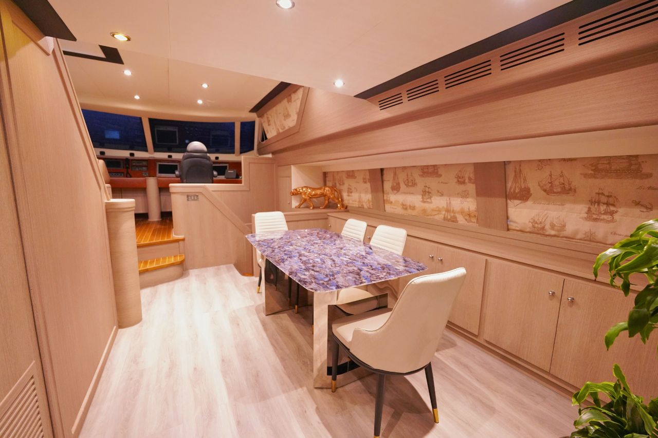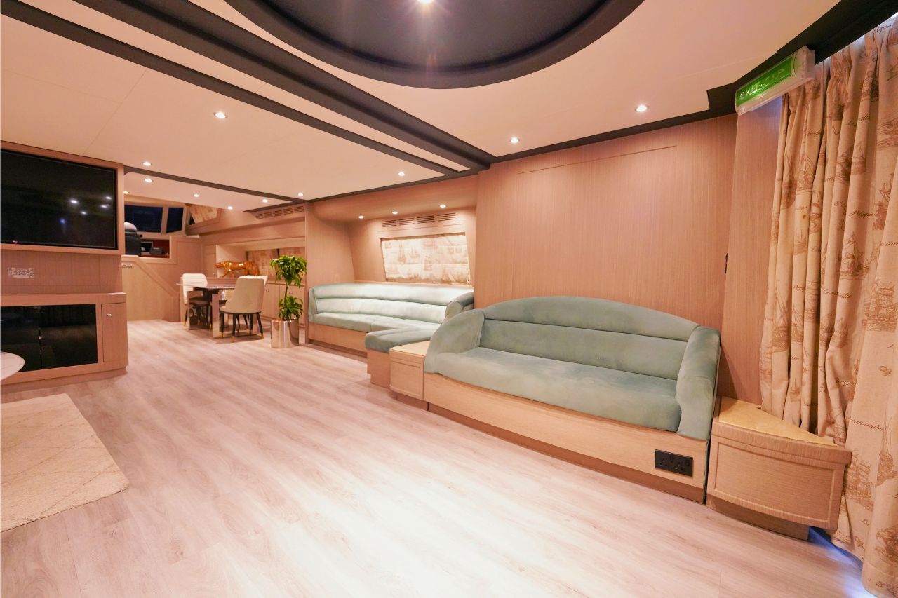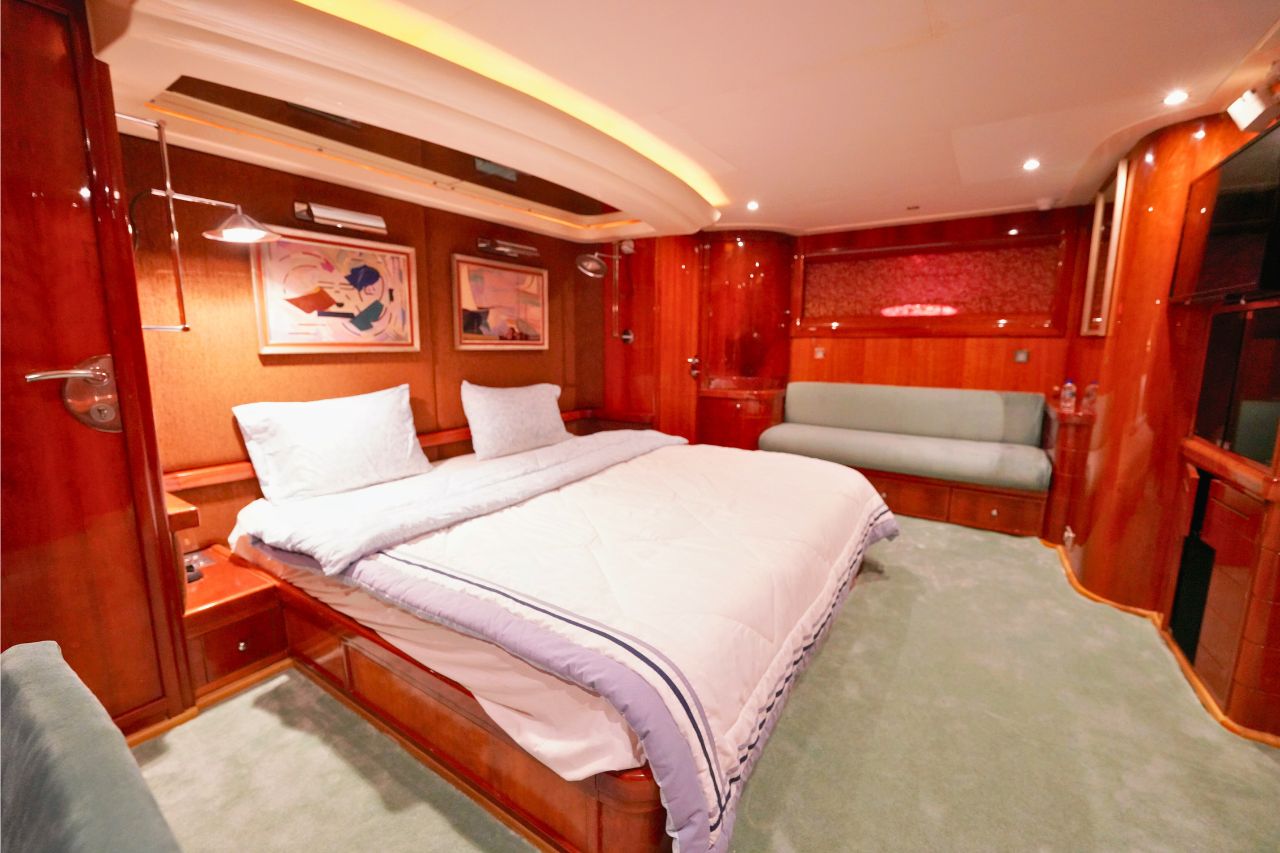 This elegant yacht features four beautifully appointed bedrooms and four modern bathrooms, making overnight stays comfortable and relaxing. The spacious flybridge offers panoramic views, ample seating, and sun loungers,  ideal for enjoying sunbathing, or simply taking in the scenery. Guests can also unwind in the on-deck Jacuzzi, adding a touch of indulgence to every cruise.